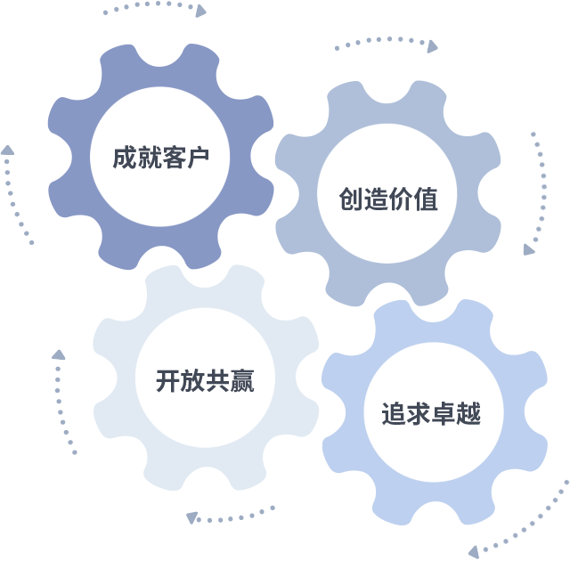成就客户是一切决策的出发点,,,,创造价值是衡量所有工作的标准,,,,追求卓越是我们做事做人的态度,,,,开放共赢是我们的格局也是最终的结果。。价值观的齿轮环环相扣,,,推动着组织里的每个人不断向前。。。。